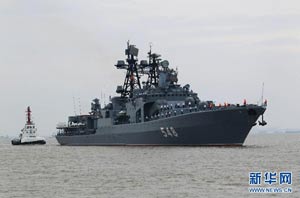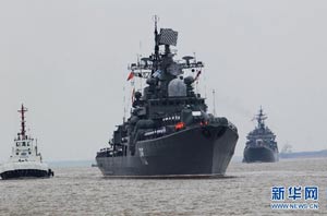當(dāng)日,參加中俄“海上聯(lián)合—2014”軍事演習(xí)的俄方艦艇陸續(xù)駛抵上海某軍港。中俄兩國(guó)海軍互鳴禮炮,中方為來訪的俄艦舉行隆重歡迎儀式。俄羅斯太平洋艦隊(duì)旗艦“瓦良格”號(hào)導(dǎo)彈巡洋艦駛?cè)胲姼蹠r(shí),參加歡迎儀式的軍樂隊(duì)奏響歡迎曲。隨后,“快速”號(hào)驅(qū)逐艦、“潘捷列耶夫海軍上將”號(hào)大型反潛艦、“伊利姆”號(hào)中型海洋油船、“涅維爾斯科伊海軍上將”號(hào)大型登陸艦,“卡拉爾”號(hào)海洋拖船陸續(xù)駛?cè)敫劭凇_@次聯(lián)合軍事演習(xí),中俄海軍都派出了主戰(zhàn)艦艇參加。中方參演兵力包括導(dǎo)彈驅(qū)逐艦、導(dǎo)彈護(hù)衛(wèi)艦、綜合補(bǔ)給艦以及導(dǎo)彈艇等水面艦艇8艘、潛艇2艘、固定翼飛機(jī)9架。俄方參演兵力包括巡洋艦、反潛艦、驅(qū)逐艦、登陸艦、油船和海洋拖船等水面艦艇6艘。此外,為執(zhí)行海上聯(lián)合解救被劫持船只、護(hù)航等特殊任務(wù),雙方還派出艦載直升機(jī)、特戰(zhàn)分隊(duì)等兵力參加此次演習(xí)。新華社記者 查春明攝