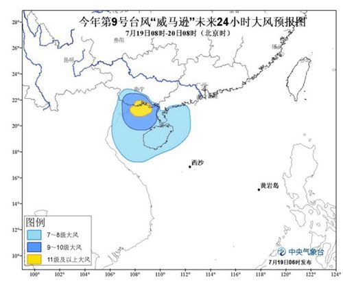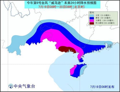 19日08時至20日08時,南海西北部、瓊州海峽、北部灣以及海南沿海、廣東西部沿海、廣西南部及沿海將有7-9級大風,其中北部灣北部、廣東雷州半島西部沿海、廣西沿海將有10-12級大風,臺風中心經(jīng)過的附近海域或地區(qū)的風力有13-15級,陣風可達16-17級;海南大部、廣東西南部、廣西南部和西部、云南東南部等地有暴雨或大暴雨,其中,廣西南部等地的局部地區(qū)有特大暴雨(250-400毫米)。