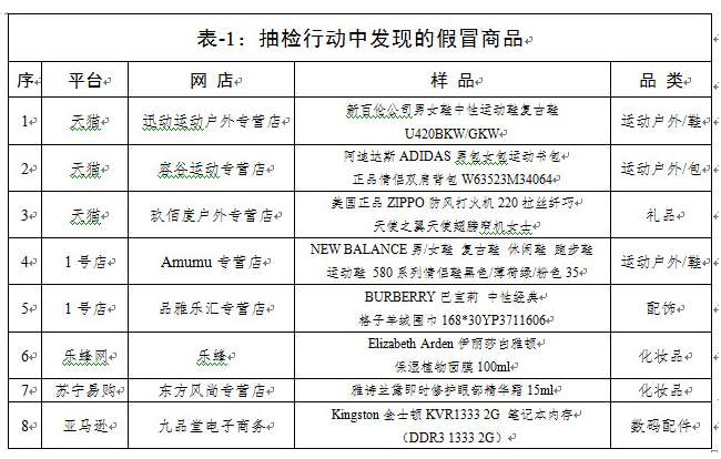 工商總局公布“雙11”期間對電商平臺促銷商品的抽檢結(jié)果:已確認(rèn)8批次樣品為假冒商品,天貓3個,1號店2個,樂蜂網(wǎng)、蘇寧易購、亞馬遜各1個;7批次樣品涉嫌假冒商品正在分析中。另有7批次樣品質(zhì)量不合格或標(biāo)簽不合法。