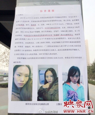 2014年12月5日,鄭州花園路北環(huán)附近一住宅區(qū)發(fā)生一起重大入室盜竊案,嫌疑人盜竊20余萬(wàn)元財(cái)物后潛逃?,F(xiàn)查明:犯罪嫌疑人張明燕,女,26歲,有兔牙,身上有明顯狐臭。警方發(fā)布協(xié)查通報(bào),懸賞萬(wàn)元緝拿。管你是誰(shuí),轉(zhuǎn)發(fā),幫警方追逃!