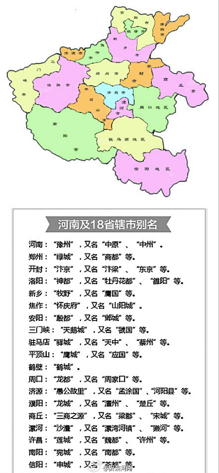 鄭州:綠城、商都。開(kāi)封:汴梁、汴京、東京;洛陽(yáng):神都、牡丹花都;新鄉(xiāng):牧野、庸國(guó);焦作:懷慶府、山陽(yáng)城;安陽(yáng):殷都、鄴城;三門峽:天鵝城、虢國(guó);駐馬店:驛城、天中;平頂山:鷹城、應(yīng)國(guó);鶴壁:鶴城;周口:龍都;信陽(yáng):申城、茶都。