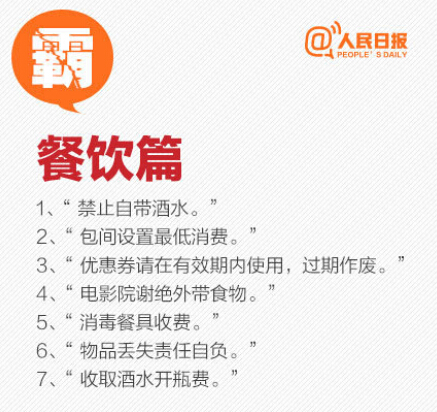 消協(xié)指出,影院禁帶食品屬霸王條款。“餐廳禁止自帶酒水”“包間最低消費xx元”“一經(jīng)售出,概不退換”“本方擁有最終解釋權(quán)”“物品丟失本店概不負(fù)責(zé)”……熟悉吧?都是霸王條款!如果遇到,果斷打12315投訴,再不忍氣吞聲!為自己擴(kuò)散