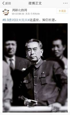 讓人難忘的細節(jié)不僅僅在閱兵場上。3日上午9時30分,習近平主席偕夫人彭麗媛正在天安門迎候各國嘉賓,閱兵尚未正式開始,會場內外興奮期待的氛圍漸濃。就在此時,網友“周顧北的周”發(fā)布了一條微博“這盛世,如你所愿”,配圖是一張周恩來總理的老照片。短短的七字微博引發(fā)了網友的強烈共鳴,轉發(fā)已過百萬。“開國大典的時候飛機不夠,周總理說飛兩遍,現(xiàn)在再也不需要飛兩遍了,要多少有多少。山河猶在,國泰民安。當年送你的十里長安街,如今已是十里繁榮?!?/p>