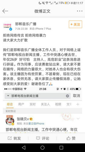 截至看法新聞?dòng)浾甙l(fā)稿時(shí),邯鄲音樂廣播官方微博對(duì)此事進(jìn)行了辟謠,不少發(fā)布此次“死亡信息”的博主也紛紛刪除了原微博?!痉ㄖ仆韴?bào)·看法新聞原創(chuàng)作品拒絕任何形式刪改,看法新聞保留追究法律責(zé)任的權(quán)利。】