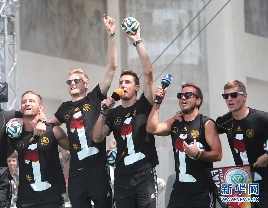 7月15日,德國隊球員克洛澤(中)、格策(右二)等參加慶?;顒?。當日,奪得2014年巴西世界杯冠軍的德國國家隊凱旋歸國。他們前往首都柏林的勃蘭登堡門,與成千上萬的球迷共同慶祝這一歷史性的勝利。7月13日,在巴西里約熱內盧馬拉卡納大球場進行的2014年巴西世界杯決賽中,德國隊以1比0戰(zhàn)勝阿根廷隊,歷史上第四次獲得世界杯冠軍。新華社記者張帆攝