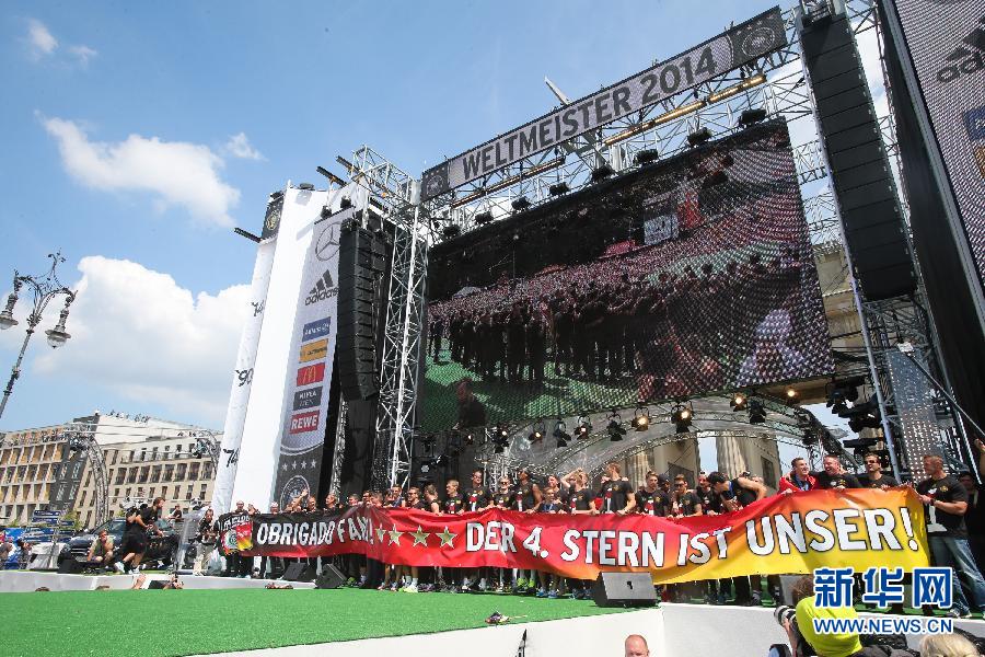 7月15日,德國隊球員參加慶?;顒?。當日,奪得2014年巴西世界杯冠軍的德國國家隊凱旋歸國。他們前往首都柏林的勃蘭登堡門,與成千上萬的球迷共同慶祝這一歷史性的勝利。7月13日,在巴西里約熱內盧馬拉卡納大球場進行的2014年巴西世界杯決賽中,德國隊以1比0戰(zhàn)勝阿根廷隊,歷史上第四次獲得世界杯冠軍。新華社記者張帆攝