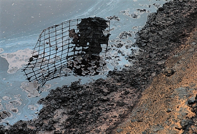 在一些洼地,可以看到一根根直接插入沙里的黑色橡膠管道,這些管道周邊的細沙呈黑色。踢開表面,下面是散發(fā)著臭味的黑色凝結物。