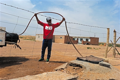 巴特爾的家在騰格里沙漠水源地上游,幾年前幾米下就能抽上水,現在水位下降至少40多米。