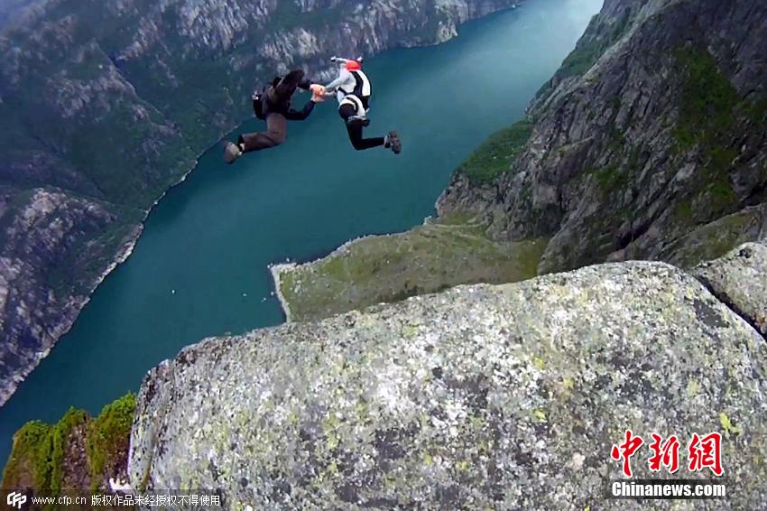 他們二人這種愛意滿滿的跳傘進(jìn)行過兩次,第一次是在挪威3500英尺(約合1066米)的懸崖往下跳;第二次是今年4月從1358英尺(約合414米)高的迪拜公主塔跳下來。 圖片來源:CFP視覺中國