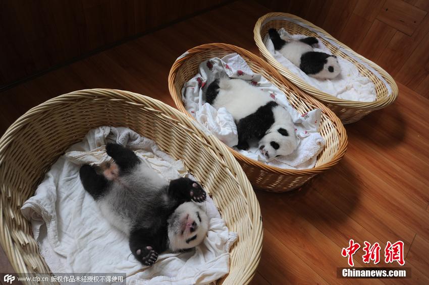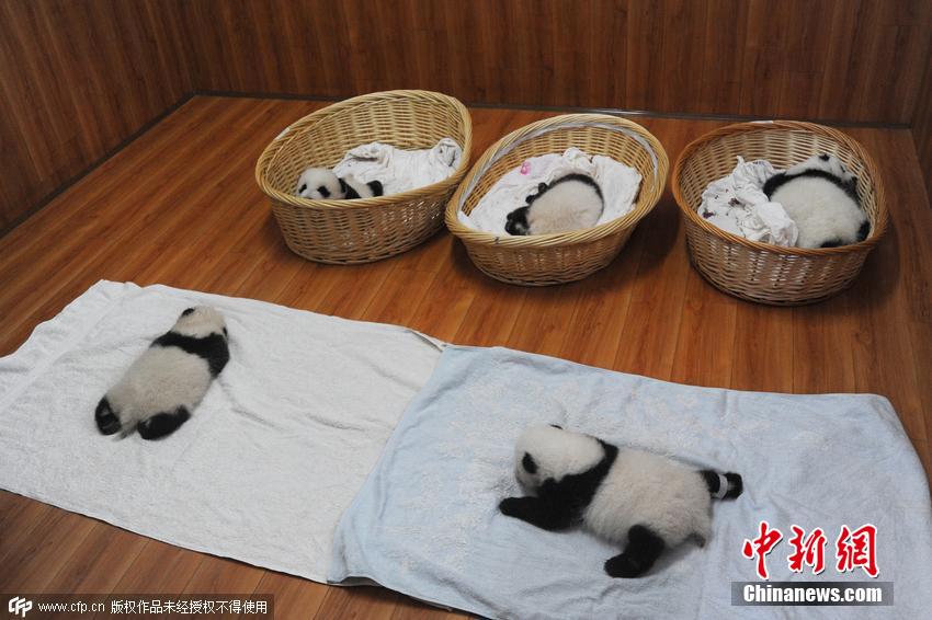 酣睡中的熊貓寶寶們。2015年大熊貓產(chǎn)仔形勢喜人,特別是大熊貓雙胞胎數(shù)量,已經(jīng)達(dá)到7對,是研究中心有記錄以來雙胞胎數(shù)量最多的一年。 圖片來源:CFP視覺中國