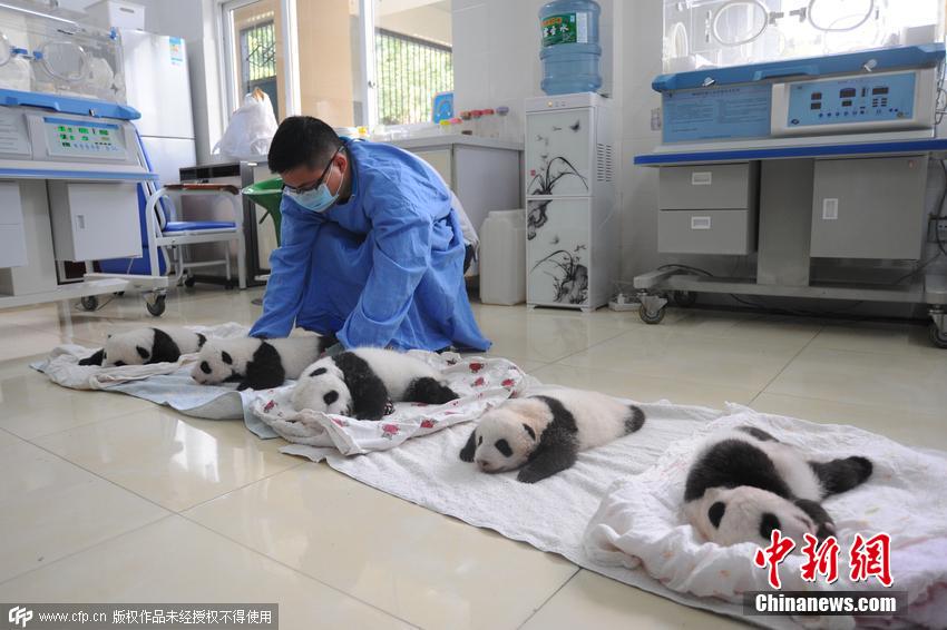 工作人員對熊貓寶寶逐個(gè)做檢查。截止目前,研究中心共繁育大熊貓14胎21仔,成活20仔,目前尚有待產(chǎn)大熊貓,有望打破新的繁育記錄。 圖片來源:CFP視覺中國
