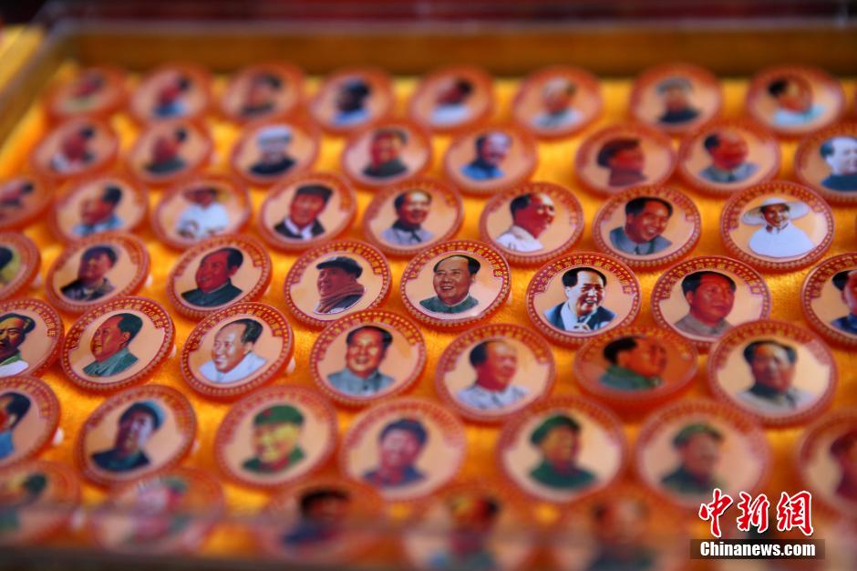 12月26日,是毛澤東誕辰122周年紀(jì)念日,河南鄭州紫荊山紫荊山廣場,鄭州退休老軍人李廷林依照毛澤東的照片或畫像制成的120枚毛澤東紀(jì)念章亮相。中新社記者 王中舉 攝