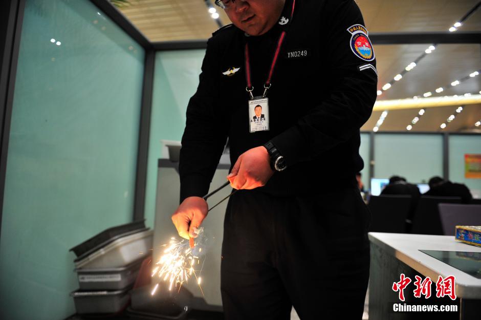 2月5日,昆明長(zhǎng)水國際機(jī)場(chǎng)安檢站工作人員,向記者展示春運(yùn)開始以來查獲的如皮帶扣打火機(jī)、iPhone造型打火機(jī)、手表打火機(jī)、煙花爆竹、子彈等各種奇葩違禁物品。中新社記者 劉冉陽 攝