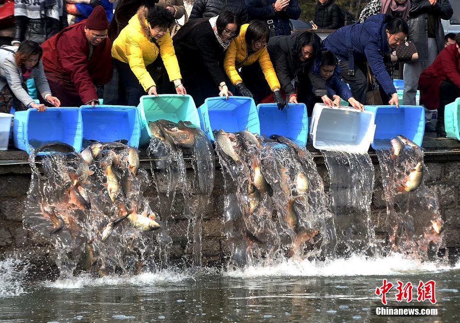 2016年2月22日,山東省濟(jì)南市,眾多市民來到大明湖南岸,以每斤4.5元的價(jià)格購(gòu)買鯉魚和鯽魚,集體將魚兒放生到大明湖,千余尾魚兒同時(shí)傾倒在湖中,場(chǎng)面頗為壯觀。