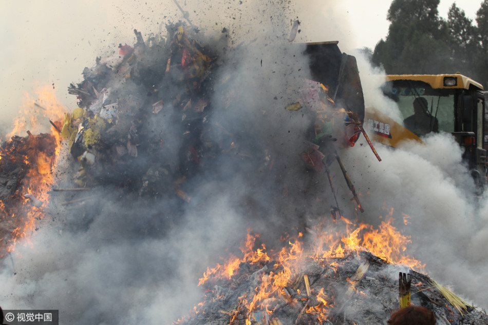 一臺(tái)大型鏟車(chē)將陵墓前香爐附近的大量燃燒物推到一處。供圖:視覺(jué)中國(guó)