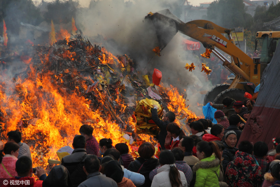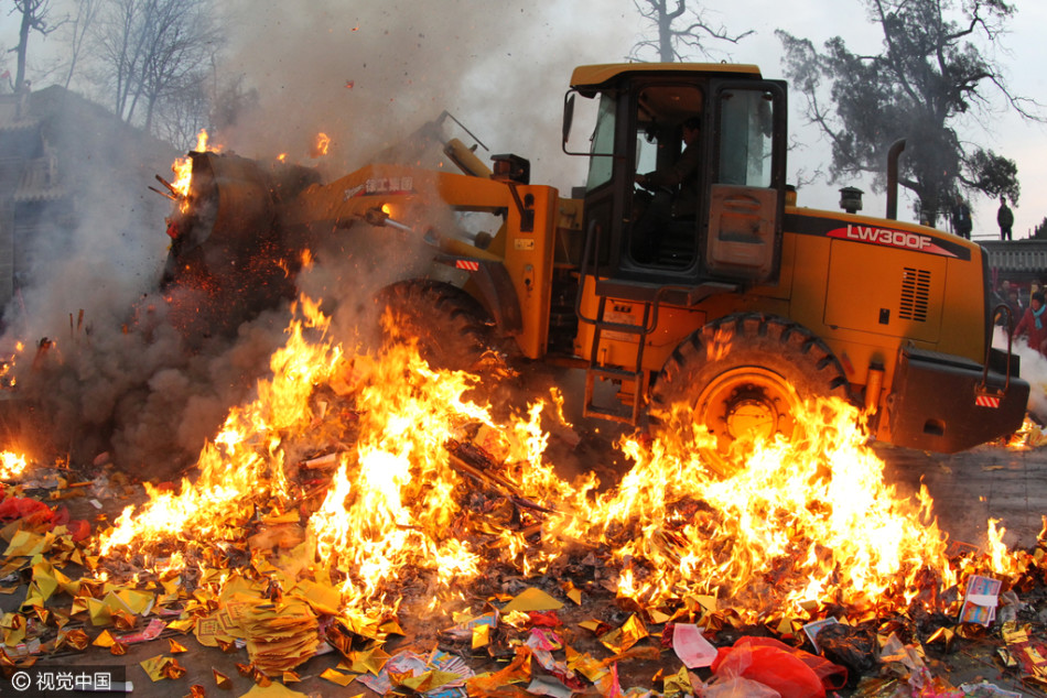 太昊陵廟會(huì)上燒高香的群眾和清理香火的鏟車(chē)。供圖:視覺(jué)中國(guó)