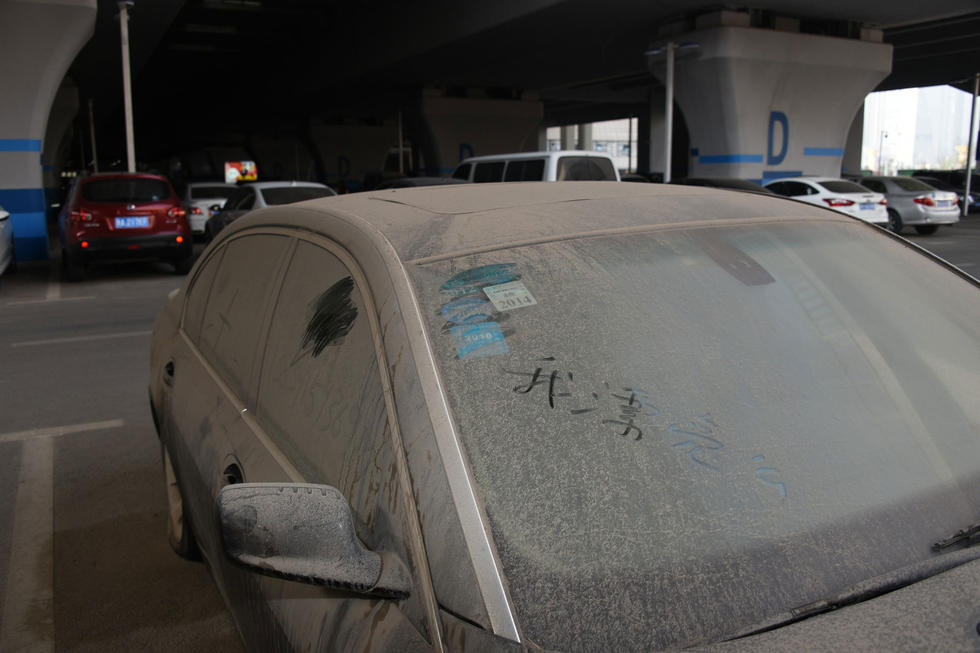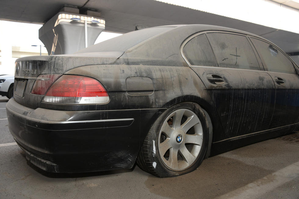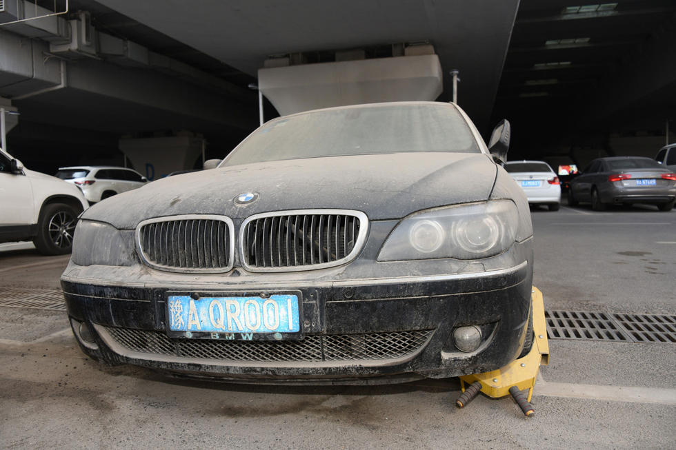 上午7時30分,中興路附近的高鐵站北區(qū)停車場,在入口處東側,這輛“蓬頭垢面”的寶馬車車全身落滿了塵土,已呈灰色。其實,這是一輛價值過百萬的黑色寶馬750LI。該車的右前后輪已經(jīng)癟了,左前輪被上了鎖。在車后備箱左側上方有一處凹陷,但不太明顯。后引擎蓋上被人寫上“下雨了”字樣。車的縫隙處堆積著厚厚的塵土,顯然,這輛寶馬車已經(jīng)在此停放已經(jīng)有很長時間了。