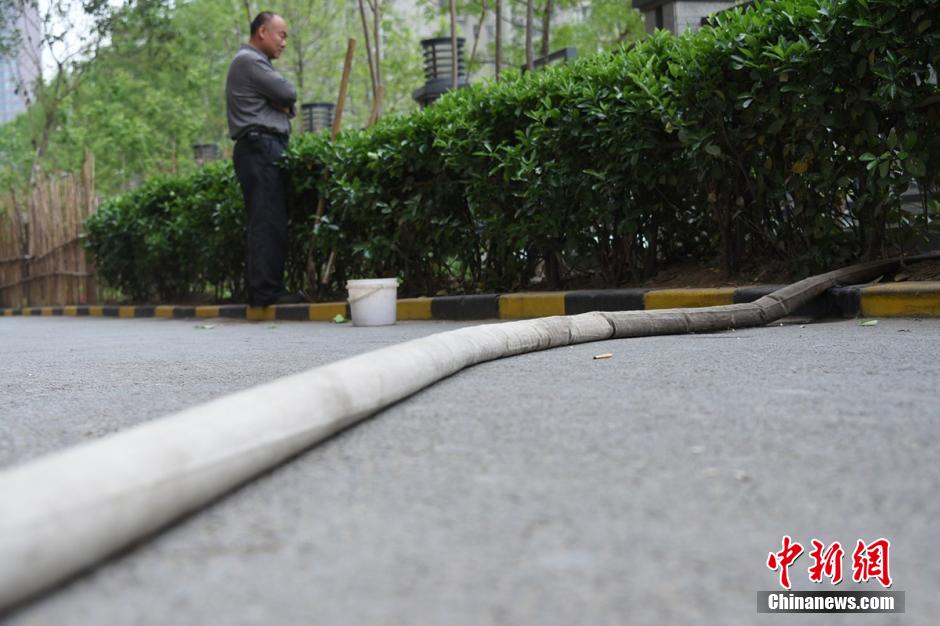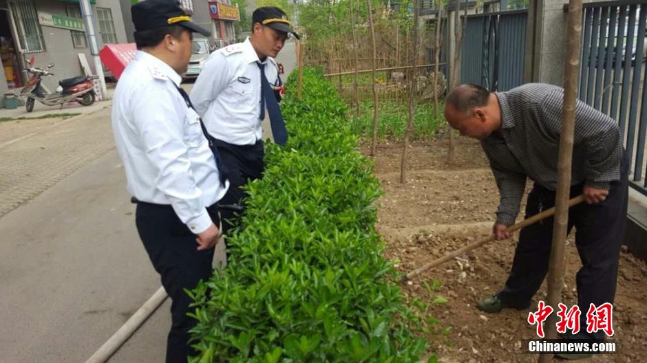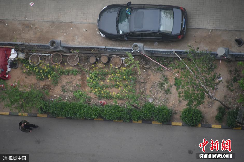 4月5日上午9時(shí)許,未來(lái)路街道巡防隊(duì)員司廣紅、盧龍等三人巡邏中發(fā)現(xiàn)一件奇葩事:有一根消防管從燕莊新區(qū)南院9號(hào)樓北面的20樓一家住戶窗口被放下,水管的另一頭直通小區(qū)柵欄里的小菜園。鄭州市燕莊村一村民住上了高樓,卻仍然放不下種地種菜。把小區(qū)垃圾清理出來(lái),開(kāi)墾出一片小菜園,又從20層的高樓往下放水澆菜。這種菜的成本遠(yuǎn)高于買(mǎi)菜,但他卻樂(lè)在其中。李四信 攝 圖片來(lái)源:視覺(jué)中國(guó)