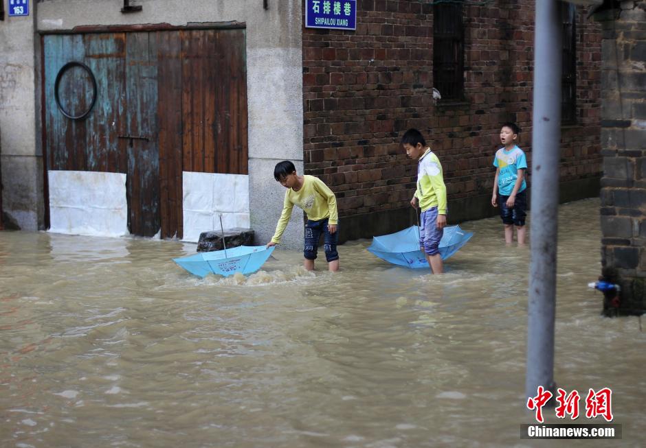 5月5日,地處湘南的永州市道縣遭遇暴風雨襲擊,縣城內多處低洼路段被水淹沒。當?shù)胤姥床块T正嚴密監(jiān)控雨情、水情,確保安全度汛。圖為市民趟水出行。 中新社發(fā) 何紅福 攝