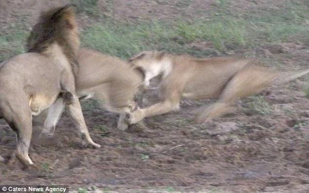 突然,兩群獅子開始內(nèi)訌,一只母獅子攻擊了一只不屬于自己群體的公獅子,試圖阻止它享用水牛。