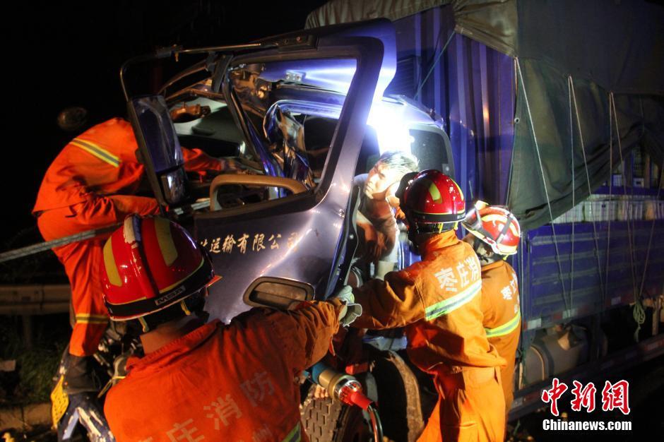 7月26日凌晨,在京臺高速滕北出口往南路段發(fā)生一起車禍,一輛裝滿鴨苗的廂貨車與半掛車發(fā)生追尾,車上3人被困,數(shù)千只鴨苗散落在高速路上。山東省棗莊市滕州消防大隊接到報警后迅速出動,對高速路面上的鴨苗進(jìn)行了驅(qū)趕,疏通高速交通,及時營救出車上被困人員。中新社發(fā) 季龍 攝 圖片來源:CNSPHOTO