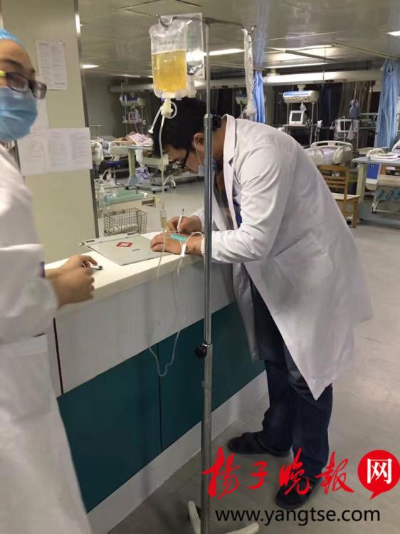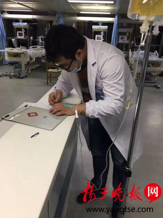 10月29日,一位身穿白大褂帶著口罩的男醫(yī)生,一邊打點(diǎn)滴,一邊為病人下醫(yī)囑的照片,出現(xiàn)在記者的微信朋友圈中。記者獲悉,這位醫(yī)生是江蘇鹽城市濱??h人民醫(yī)院的一名醫(yī)師,當(dāng)時正在搶救病人,現(xiàn)場非常感人。圖片來源:揚(yáng)子晚報網(wǎng)