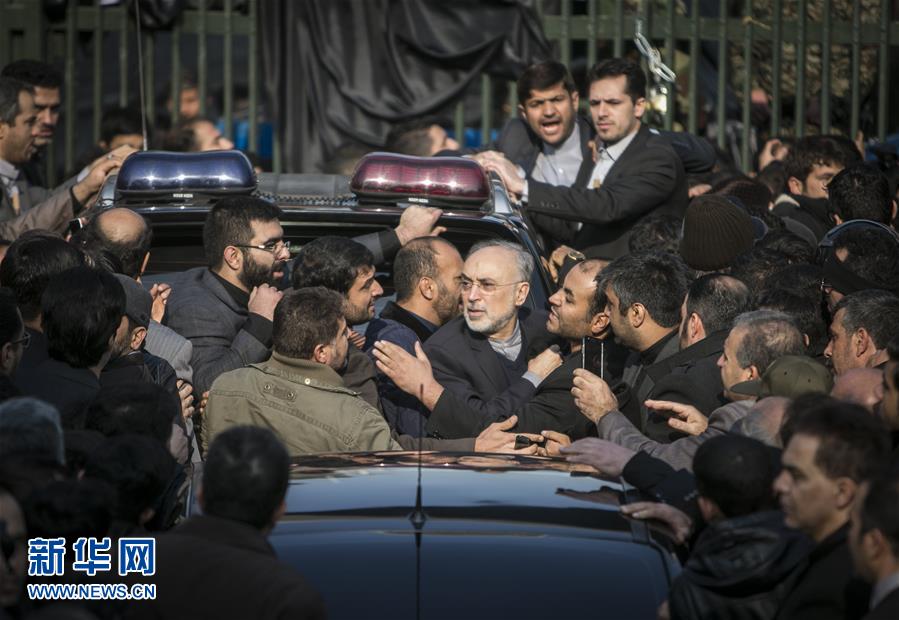 1月10日,在伊朗德黑蘭,伊朗原子能機構主席阿里·阿克巴爾·薩利希(中)送別伊朗前總統(tǒng)阿克巴爾·哈什米·拉夫桑賈尼。新華社發(fā)(艾哈邁德·哈拉比薩斯攝)