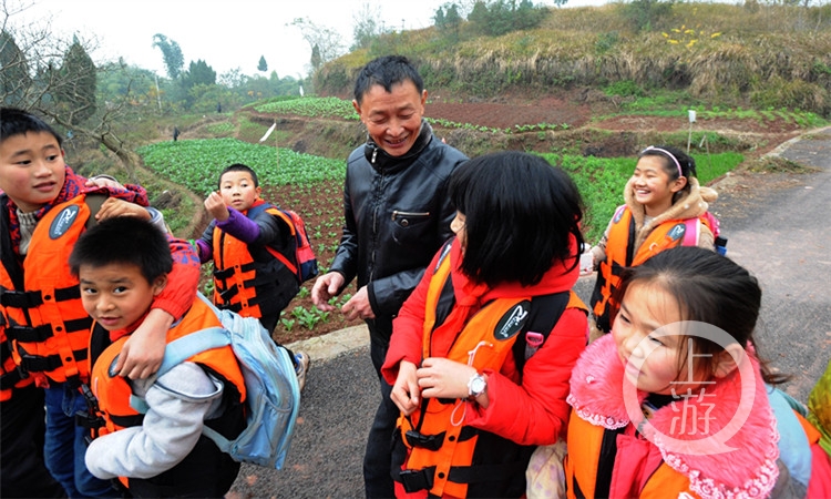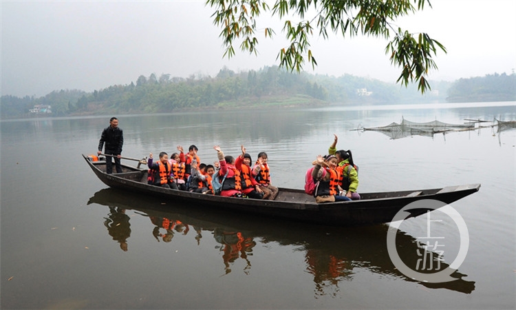 每當上學放學的時候,在大足區(qū)響水灘水庫,平靜的水面上,總能看見一條小小的木船來回穿梭。上學時,撐船的人把岸邊的孩子一個一個牽上小船;放學時,撐船的人把船上的孩子一個一個牽下小船。