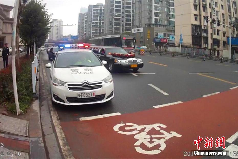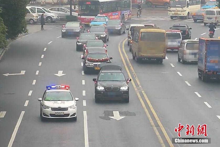 2月22日,湖北宜昌一位新郎在迎親時,迎親車隊的頭車因涉嫌套牌被交警查獲。在新郎家屬和交警溝通后,當(dāng)?shù)亟痪诵曰瘓?zhí)法,先“開道護(hù)送”,迎親結(jié)束后才扣下套牌車。圖為警車“護(hù)送”新人完成儀式。石寧 攝