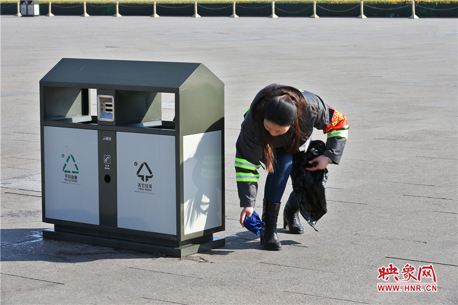 一位清潔員清理著垃圾箱,保持廣場上每一處的潔凈
