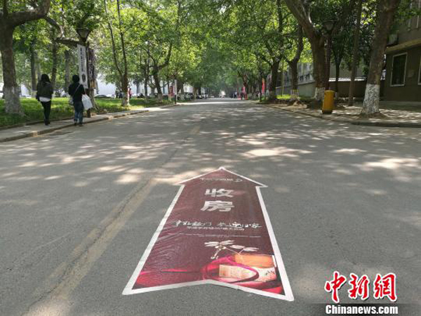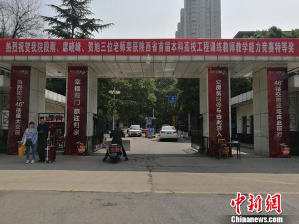 校園內(nèi)貼有收房指示路標(biāo)。記者4月27日在西安建筑科技大學(xué)華清學(xué)院看到,華清學(xué)府城與該校緊鄰,中間有一道門可以進(jìn)出。樓盤交房廣告標(biāo)語張貼于學(xué)校大門的門柱上,寫有“交房臨時停車由此進(jìn)入”、“46#樓交房現(xiàn)場由此前行”、“熱烈祝賀46#樓盛大交房”等標(biāo)示。