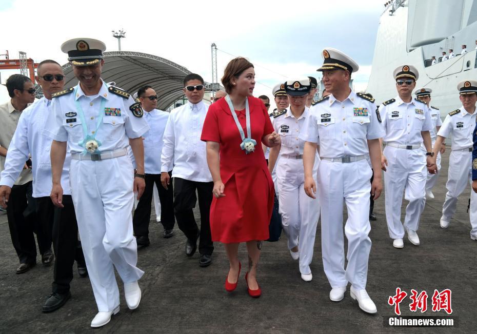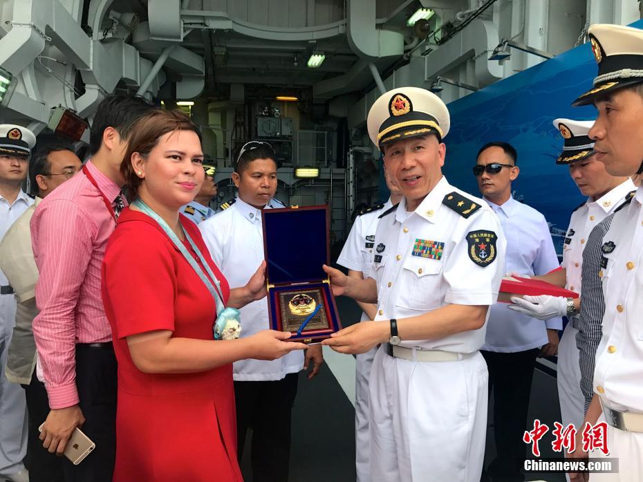 中國海軍政委苗華與達(dá)沃市長薩拉·杜特爾特女士交談。 中新社記者 張明 攝