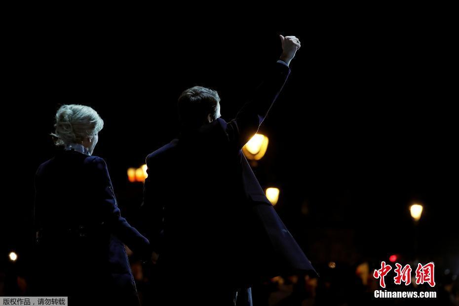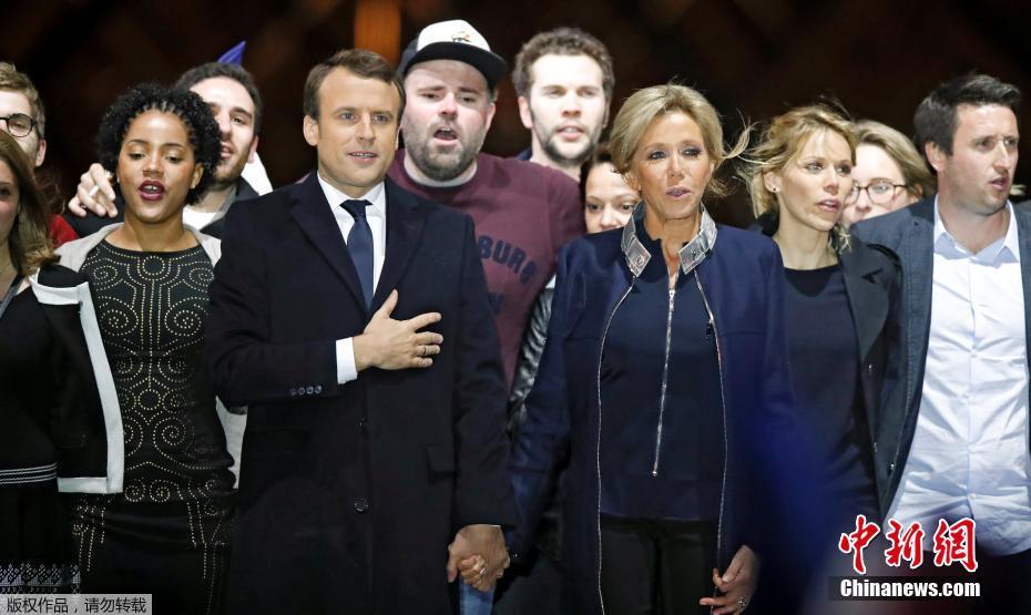 巴黎時(shí)間5月7日晚,法國(guó)總統(tǒng)選舉第二輪投票初步計(jì)票結(jié)果顯示,中間派獨(dú)立候選人、“前進(jìn)”運(yùn)動(dòng)領(lǐng)導(dǎo)人埃馬紐埃爾·馬克龍以大幅優(yōu)勢(shì)擊敗極右翼政黨“國(guó)民陣線”候選人馬麗娜·勒龐。年僅39歲的馬克龍由此成為法國(guó)史上最年輕的總統(tǒng),也成為世界上最年輕的大國(guó)領(lǐng)導(dǎo)人。圖為馬克龍(左二)和妻子布麗吉特(右二)在慶祝勝選的集會(huì)上向支持者致意。中新社記者 龍劍武 攝