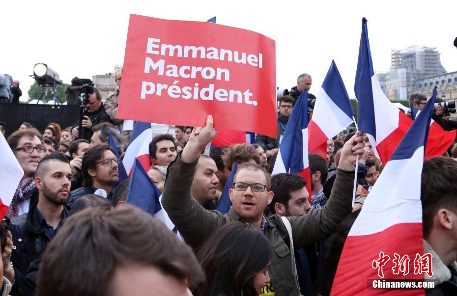 巴黎時(shí)間5月7日晚,法國(guó)總統(tǒng)選舉第二輪投票初步計(jì)票結(jié)果顯示,中間派獨(dú)立候選人、“前進(jìn)”運(yùn)動(dòng)領(lǐng)導(dǎo)人埃馬紐埃爾·馬克龍以大幅優(yōu)勢(shì)擊敗極右翼政黨“國(guó)民陣線”候選人馬麗娜·勒龐。年僅39歲的馬克龍由此成為法國(guó)史上最年輕的總統(tǒng),也成為世界上最年輕的大國(guó)領(lǐng)導(dǎo)人。圖為馬克龍的支持者在慶祝勝選的集會(huì)上高舉標(biāo)語(yǔ)。中新社記者 龍劍武 攝