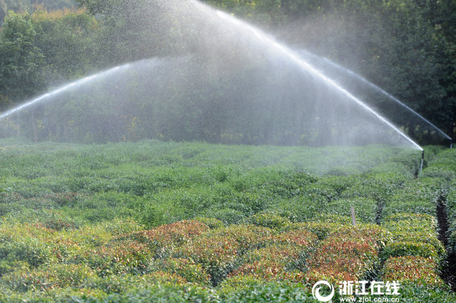7月27日傍晚,杭州西湖區(qū)雙峰村龍井茶園,全自動噴灌系統(tǒng)在為“曬傷”的茶樹澆水。