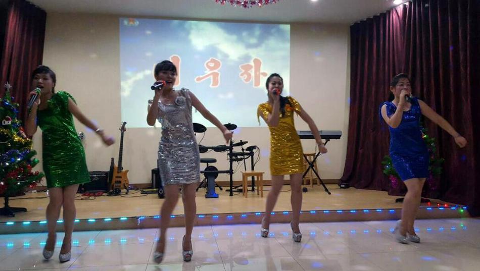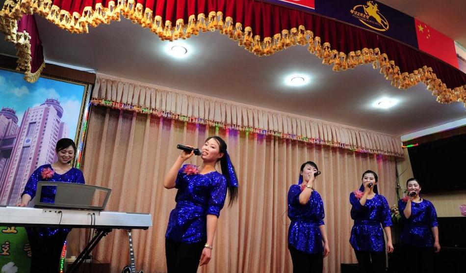朝鮮餐廳的服務員在表演歌舞。