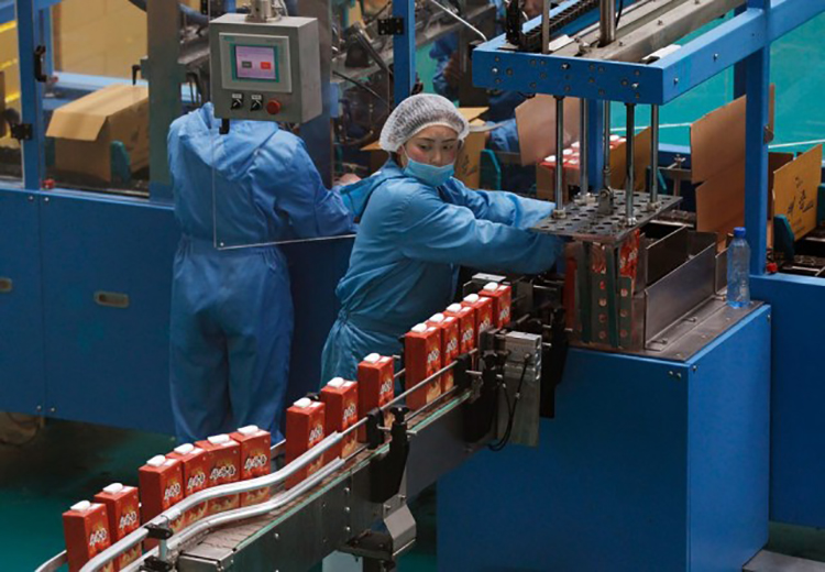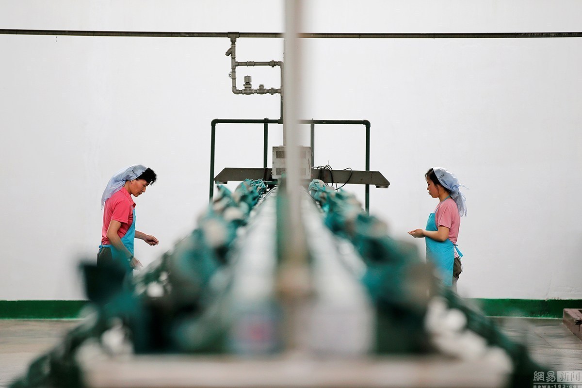 工人在一家工廠的果汁生產(chǎn)線進行操作,這附近的Daedonggang水果農(nóng)場坐落在平壤郊區(qū),擁有125公頃的蘋果樹。
