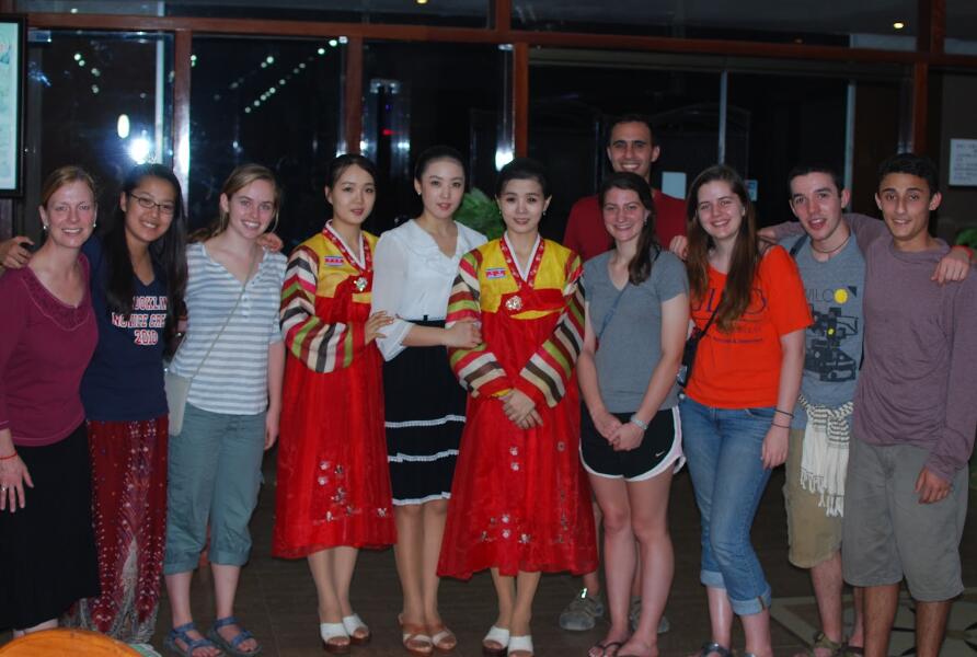 朝鮮餐廳的服務員與國外顧客合影。