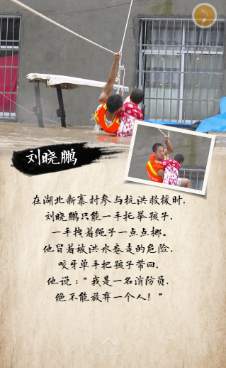 在湖北新寨村參與抗洪救援時,劉曉鵬只能一手托舉孩子,一手拽著繩子一點(diǎn)點(diǎn)挪。他冒著被洪水卷走的危險,咬牙單手把孩子帶回 ,他說:“我是一名消防員,絕不能放棄一個人!”