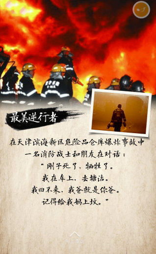 在天津?yàn)I海新區(qū)危險品倉庫爆炸事故中,一名消防戰(zhàn)士和朋友在對話:“剛子死了,犧牲了。我在車上,去塘沽。我回不來,我爸就是你爸。記得給我媽上墳?!?/p>