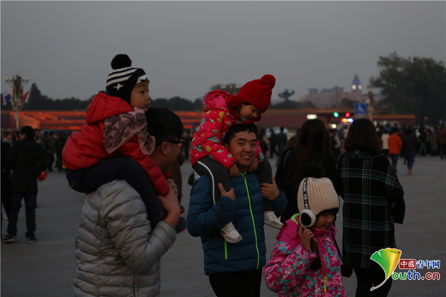 騎在家長頭頂上觀看降旗儀式的孩子們。中國青年網(wǎng)通訊員 李超 攝