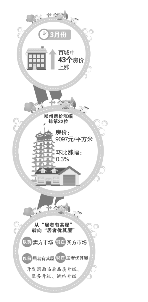 中國指數(shù)研究院昨日發(fā)布的百城房價(jià)指數(shù)顯示,3月份,100個城市中有43個房價(jià)上漲,全國房價(jià)環(huán)比整體跌幅收窄,微跌0.15%,同比跌幅繼續(xù)擴(kuò)大,下跌4.35%。其中,鄭州3月份新建商住房均價(jià)為9097元/平方米,環(huán)比上漲0.3%,漲幅在全國排到第22位。