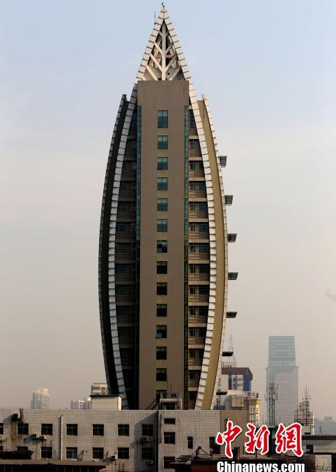 鄭州市環(huán)境保護(hù)局辦公大樓有19層高,從下面往上看,下邊窄,中間橢圓,頂部尖,頂端部分還有“葉脈”,邊緣有毛狀物,整體極像一片橢圓形的“樹葉”。