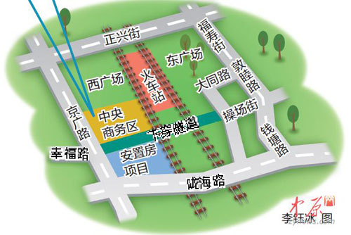 讓人欣喜的是,西廣場南側(cè)的幸福路將連接火車站東西兩個(gè)廣場,打通下穿隧道。幸福路南起京廣路,北到操場街,不但可行駛機(jī)動(dòng)車,還可供非機(jī)動(dòng)車、行人通行。從規(guī)劃圖上可看出,規(guī)劃中的幸福路,和現(xiàn)狀幸福路,不在一條直線上,它們?cè)诰V路上有拐角。