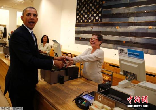 資料圖:當?shù)貢r間2014年3月11日,美國紐約,美國總統(tǒng)奧巴馬在服裝商店中為妻女選購衣物。