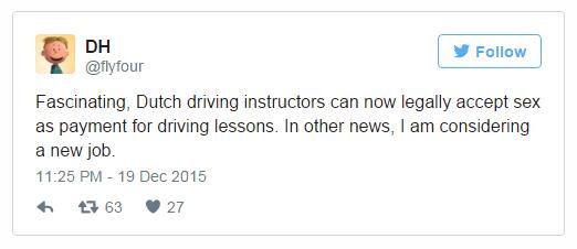 據(jù)荷蘭新聞(Dutchnews)網(wǎng)站12月14日?qǐng)?bào)道了該國(guó)議會(huì)一件令人震驚的決議——駕校教練可以用性回報(bào)代替現(xiàn)金來(lái)收費(fèi)。這一消息引起媒體大嘩,大約一周后(21日),各國(guó)媒體議論紛紛。赫芬頓郵報(bào)的副標(biāo)題就是“Ride for a ride”意為可以用性來(lái)?yè)Q一段路程,CNN報(bào)道稱:“Go Dutch”現(xiàn)在有了新的意味,因?yàn)闅W洲男性開始涌向荷蘭,遞交擔(dān)任駕校教練申請(qǐng)。根據(jù)荷蘭政府方面的消息,申請(qǐng)量比之前增加了5倍。