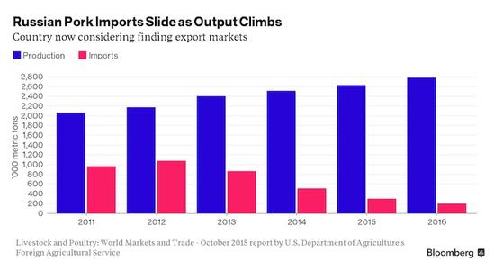 據(jù)彭博社報道,美國農(nóng)業(yè)部數(shù)據(jù)顯示,俄羅斯國內(nèi)豬肉產(chǎn)量四年里增加了26%,創(chuàng)下了歷史最高水平;與此同時,進(jìn)口從2012年的峰值下降了超過80%。