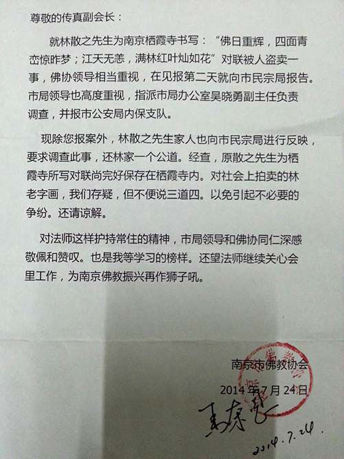 7月24日,傳真法師收到一封南京市佛教協(xié)會(huì)的回函。回函稱(chēng),除了傳真法師報(bào)案外,林散之家人也向市民宗局反映,要求調(diào)查此事,還林家一個(gè)公道。