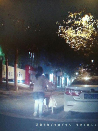 當(dāng)晚7點(diǎn)左右,童先生在市一醫(yī)院門口停車等待妻兒,一名推著童車的婦女的舉動引起童先生注意。