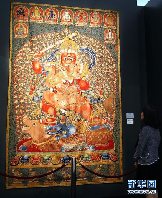一位觀眾在香港佳士得2014年秋季拍賣會預展上觀看明永樂御制紅閻摩敵刺繡唐卡(11月21日攝)。新華社記者李鵬攝